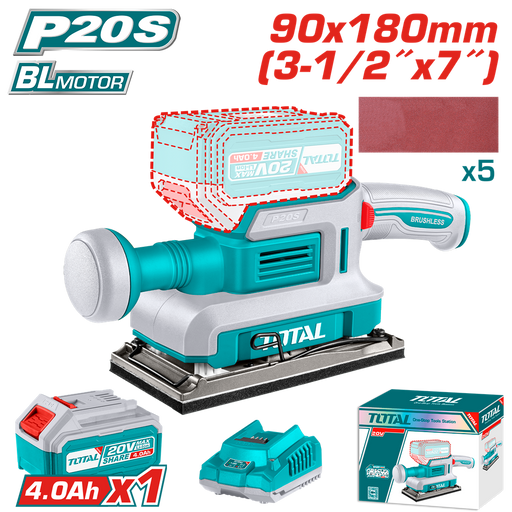 Brushless motorVoltage: 20VBottom base: 90mmx180mmNo-load speed:13000rpmAluminum durable baseInclude:5 Pcs sand paper1 Pcs 4.0Ah battery pack(TFBLI...
