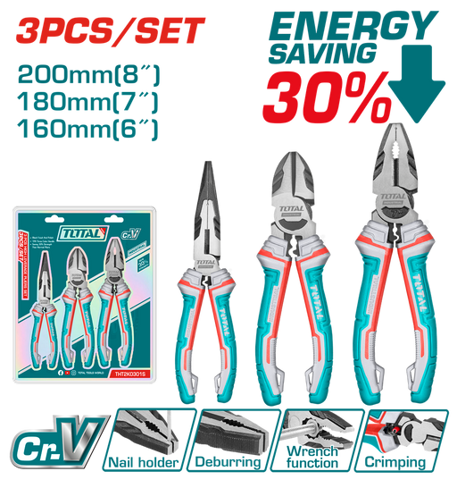Size:8" High leverage combination pliers7" High leverage diagonal cutting pliers6" High leverage long nose pliersCr-V,black finish and polishTPR th...