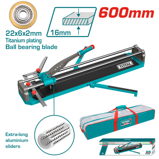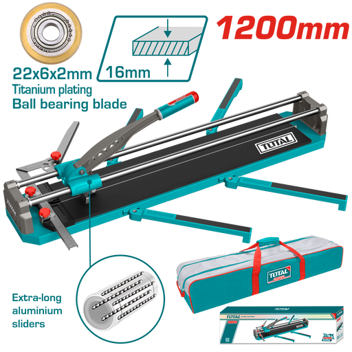 Tile cutterMax cutting length:1200mmMax cutting thickness:16mmAluminum die cast handleBlade size:22x6x2mm Tungsten carbide ball bearing blade Soli...