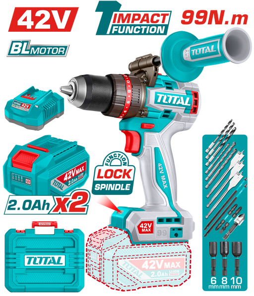 Brushless motor Voltage: 42V No-load speed: 0-500/0-2000rpm Max impact rate: 30000bpm Max torque: 99Nm Metal chuck Chuck capacity: 13mm Torque sett...